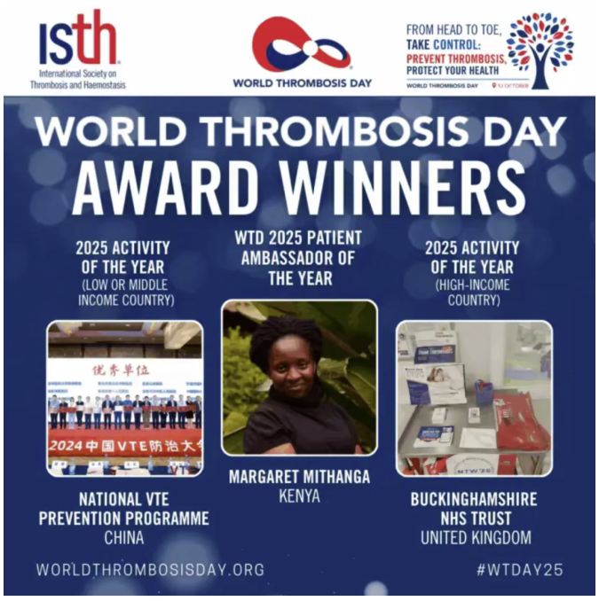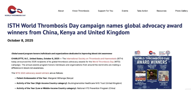2025年10月8日,国际血栓与止血学会(International Society on Thrombosis and Haemostasis, ISTH)正式公布2025年世界血栓日全球倡导奖获奖名单。我国肺栓塞和深静脉血栓形成防治能力建设项目(以下简称“VTE项目”)因其在中国全方位提升血栓认知与防治水平所作出的卓越贡献,荣获“年度最佳活动奖”。该奖项体现了国际血栓领域同道对我国在静脉血栓栓塞症(VTE)防治体系建设与系统性推广工作的高度认可。