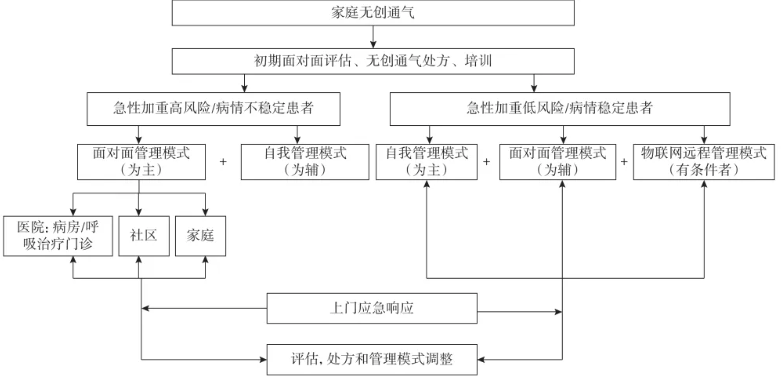 (1)传统“面对面”管理模式(医院—社区—家庭联动管理模式):传统“面对面”管理模式是以线下实体医疗资源为基础,通过医院、社区医疗机构和家庭的层级协作,为患者提供HNIV管理支持[163]。该模式的核心是由医护人员面对面指导患者及家属完成设备使用、参数调整和病情监测。医院呼吸病房出院前或在呼吸治疗门诊制定个性化的HNIV治疗和呼吸康复训练方案[164];社区卫生服务中心可承担后期的居家管理[163,165]。该模式优点在于直接沟通、监测患者情况和现场操作指导,社区医生也能够快速响应上门处理急性事件。缺点是对线下医疗资源依赖性强,患者需频繁往返医院或社区,病情监测的连续性不足等。(2)基于物联网的远程管理模式:基于物联网的远程管理模式是通过智能技术将家庭无创呼吸机与云端平台连接,实现患者的生理数据和设备参数的实时传输与分析[166],目前已经应用于OSA[167-170]和慢阻肺[88,171-172]等HNIV患者的居家管理,可明显改善HNIV的依从性。该模式的运行依赖远程医疗中心、家庭智能设备和网络支持。医院端负责监控数据和线上会诊;家庭端通过智能无创呼吸机自动采集各种数据;互联网作为数据传输媒介,支持医患通过远程视频、微信、短信和监控系统等进行沟通;呼吸治疗门诊提供线下补充服务。该模式的优势在于实时监测、自动预警、能够整合多中心数据,并打破了地域限制。缺点包括技术门槛较高、缺乏面对面的人文关怀、存在医疗数据泄露风险和远程医疗系统相关医疗纠纷等。(3)二元管理模式(医疗模式+自我管理模式):“自我管理”模式是针对个人采取的旨在改善自我健康行为和自我管理技能的结构化干预措施[173]。在HNIV管理中,患者及家属执行日常规范操作,并通过纸质记录、电话或门诊反馈使用和异常情况;通过自我管理干预,以明确在不同情况下的处置方案,如电话咨询、视频会诊或急诊入院等;改变自身健康行为和获得良好情感支持,实现长期有效管理。研究表明与单纯的“医疗管理”相比,该模式可改善患者生活质量,降低呼吸相关住院率[174]。
