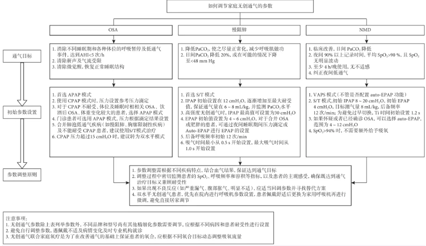 建议在医院和社区卫生中心进行参数的调节,确定参数合适及安全性后再长期居家使用,尽量避免患者或家属盲目调节参数,引起不良事件【中质量证据,强推荐】。无创通气的压力设置需根据患者原发疾病及其无创通气临床目标进行设置,还需要设置包括后备频率、吸气灵敏度、压力上升时间、呼气灵敏度等参数,设置流程总结见图1【中质量证据,强推荐】。