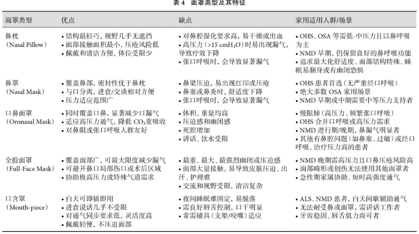 面罩、湿化器及其他附件的选择和保养直接影响HNIV的依从性和疗效。面罩的选择应在密封性、舒适度、疾病特异性及易用性之间取得平衡。常用连接界面包括鼻罩(nasal mask)、鼻枕(nasal pillow)、口鼻罩(oronasal mask)、全脸面罩(full-face mask)及口含罩(mouth-piece)。其优缺点及使用场景如表4。对于慢阻肺患者,首选口鼻罩,因其能显著减少张口呼吸导致的漏气并降低CO2重复吸入风险,尤其适用于漏气明显或需较高通气压力的场景[89],头带宜采用四点固定设计,以在确保密封的同时均匀分散面部压力。OHS患者应优先选择鼻罩或鼻枕,并配合可调节头带,以避免体位变化引起的漏气[54];如合并经口呼吸或需较高通气压力,则推荐改用口鼻罩。NMD患者的面罩应随肌力水平动态调整:早期保留鼻呼吸功能者可使用鼻枕或鼻罩;肌力明显下降或需高压力支持时,应优先选用口鼻罩。面罩尺寸通常分为不同型号,如超小、小、中、大、超大号,并可进一步细分为狭长、标准和加宽型。正式使用前应根据面部尺寸试戴并视需要进行短期佩戴体验。佩戴过松会导致漏气,过紧则易造成局部压迫及不适,临床应在舒适度与可接受漏气范围内调整松紧。使用下颌带(chin strap)能进一步降低口漏气,且需定期评估适配性[20]。