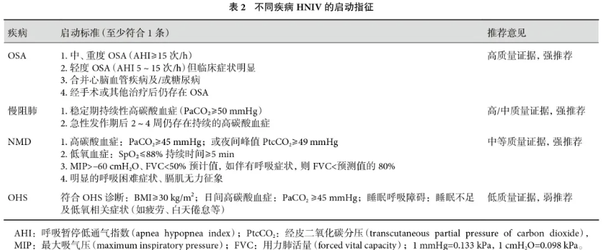 开始HNIV治疗的时机需基于疾病诊断、严重程度、症状及合并症综合决策,早期规范化干预是改善预后、降低长期疾病负担的重要措施。具体推荐指征见表2【高/中质量证据,强推荐】。