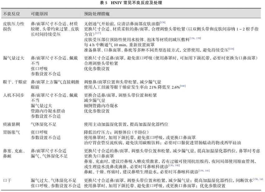 不良反应会影响无创通气治疗效果和患者依从性,各种无创通气不良反应的发生率大约为5%~50%[124]。可分为人机连接方式相关的不良反应、湿化相关不良反应和压力和流速相关的不良反应。具体处理方法总结如表5。