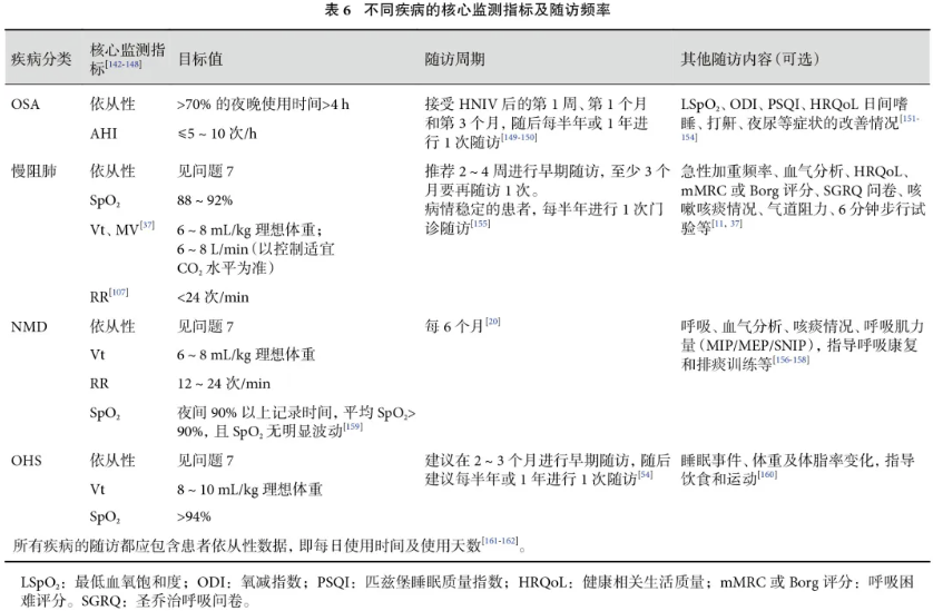 建议对HNIV患者密切监测和随访。监测指标及随访频率总结见表6【中质量证据,GPS】。HNIV重点关注的三个方面:依从性(如使用时长、天数)、疗效和不良反应(表5)。