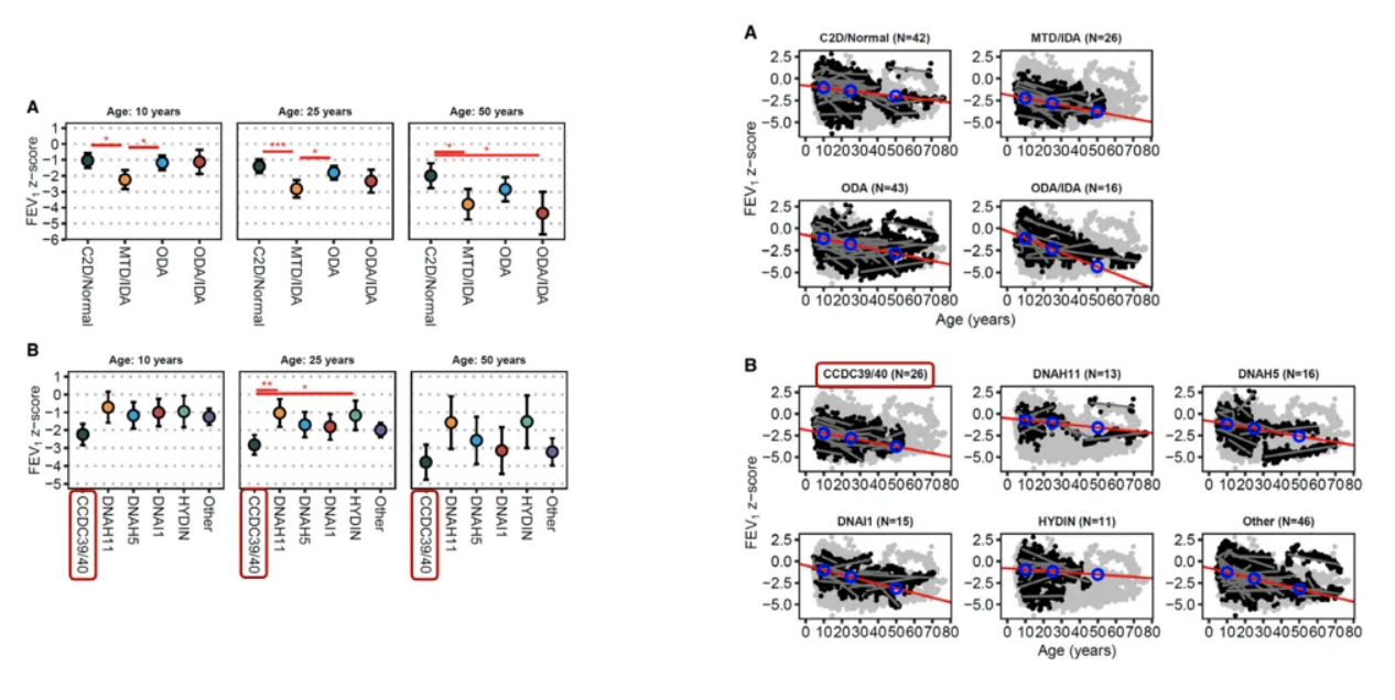 一项德国、丹麦随访43年的PCD患者队列研究比较不同结构缺陷与基因突变患者的远期肺功能改变,发现CCDC39和CCDC40突变患者更易早期出现肺功能损害,且加重程度更明显。证明基因检测结果可能提示患者疾病恶化程度[17]。