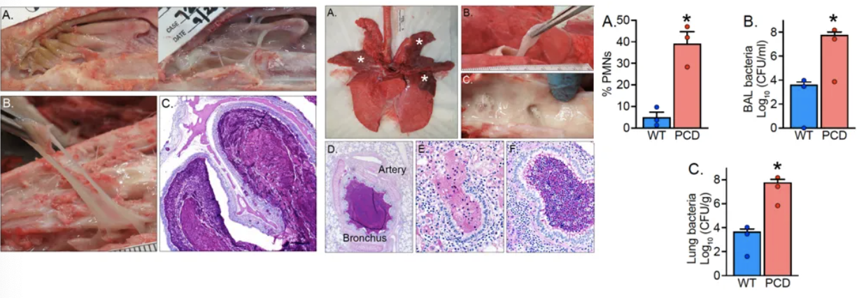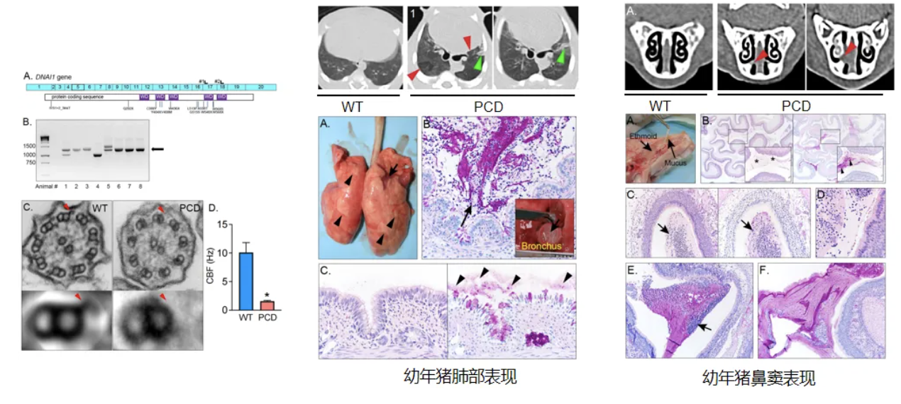 这是PCD猪动物模型,美国爱荷华大学运用CRISPR-Cas9技术构建DNAI1基因敲除猪,幼年时观察到肺叶塌陷不张、气道与鼻窦黏液聚积,但无明显感染[27]。