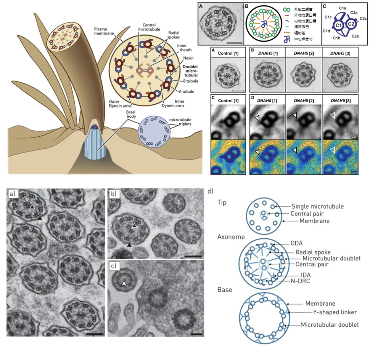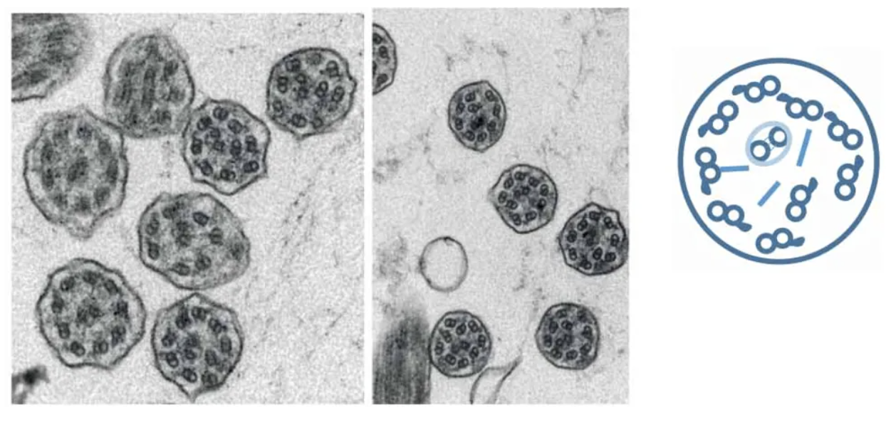 纤毛透射电子显微镜,其结果判定目前主要参考 2020 ERJ:BEAT PCD TEM Criteria。图为正常的纤毛电镜结构,在判读时需注意将纤毛尖端和基底部与异常结果进行区分[18-20]。