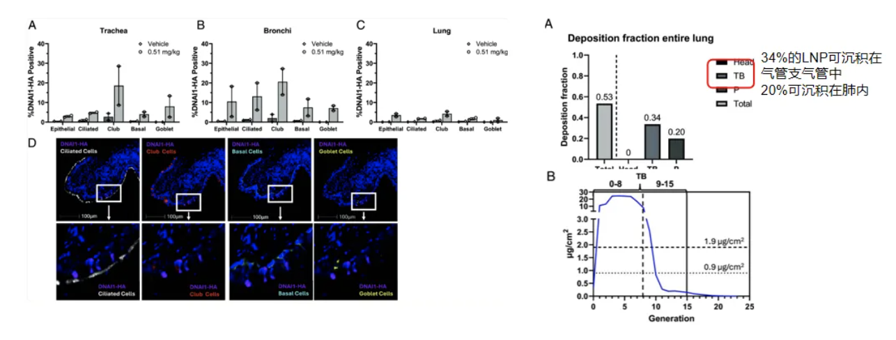 这是DNAI1动物试验。经插管向食蟹猴气道内吸入输送DNAI1 mRNA脂质纳米粒可以在食蟹猴气管、支气管与肺内检测到DNAI1表达,提示该疗法具备成功的可能性。其局限性是未构建PCD疾病模型评估治疗情况[25]。
