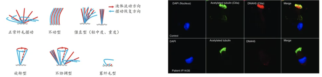 关于PCD的诊断方法,主要围绕“先天性”和“纤毛”:① 是否为“先天性”:基因检测,最常用的检测方法为全外显子测序。其他提示性信息:父母为近亲结婚、有支扩家族史(兄弟姐妹)、自幼起病;②“纤毛”相关检测:纤毛结构检测:纤毛透射电子显微镜、纤毛免疫荧光检测(纤毛结构蛋白的抗体)。纤毛功能检测:高速视频显微镜分析。呼吸道纤毛功能的间接体现:内脏反位、鼻窦炎、中耳炎、不孕不育、精液常规、精子透射电子显微镜;③ 经鼻一氧化氮检测(目前发现PCD和囊性纤维化会出现特异性下降,但机制不明)。欧洲呼吸协会和美国胸科协会的PCD确诊标准为:基因检测显示PCD双等位致病变异或者纤毛透射电子显微镜显示特异性的纤毛相关缺陷[3-4]。