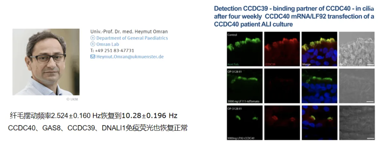CCDC40也是靶向治疗的探索。Ethris公司在mRNA疗法治疗肺部疾病的方面的领先地位,具有非免疫原性修饰mRNA 和类脂质纳米颗粒 (LNP) 递送平台。CCDC40患者的离体鼻纤毛细胞mRNA治疗6周,成功恢复了纤毛的结构和功能[28-29]。