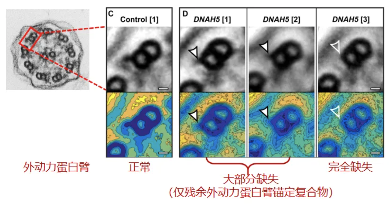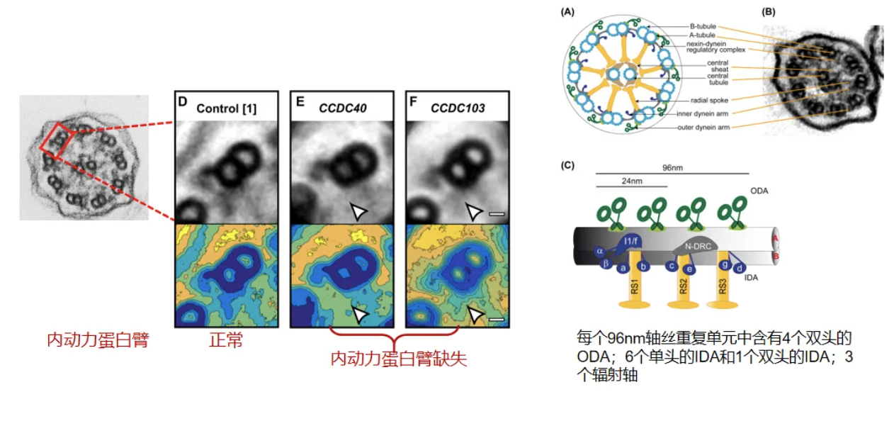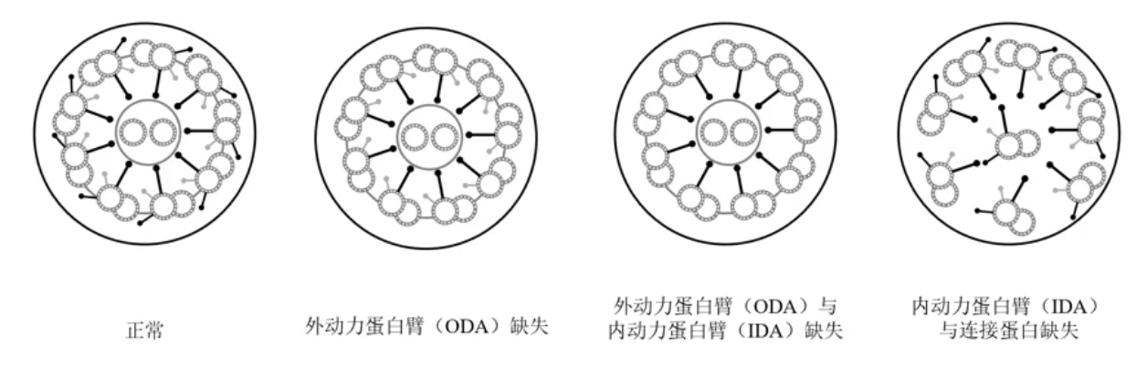 IDA(内动力蛋白臂)缺失,一个轴丝中内动力臂异常的定义:9个外周微管对中至少7个有完全缺失。内动力臂缺失:超过50%的轴丝有内动力蛋白臂异常[20]。