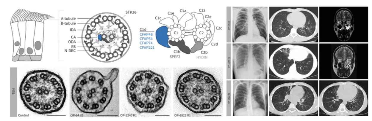 电镜结果无异常的PCD举例:CFAP46、CFAP54、CFAP74、CFAP221编码蛋白组成中央微管对C1的附属突起结构C1d,此类基因突变患者具有PCD的临床表现,但电镜超微结果未发现异常[21]。