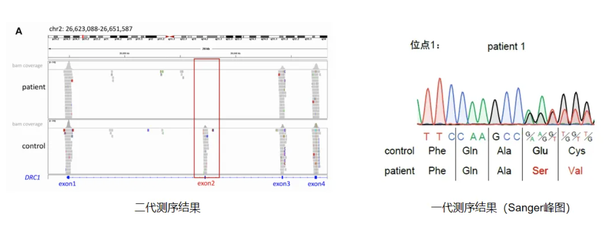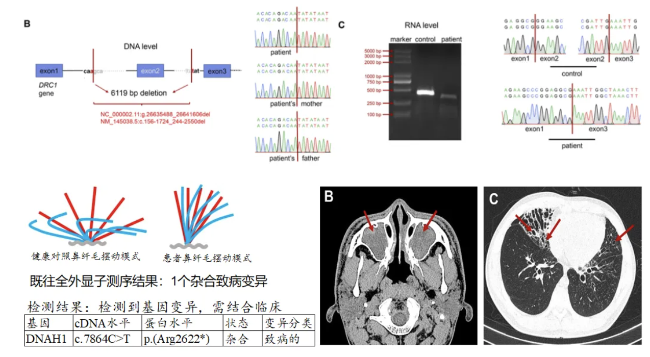 通过基因检测,结果发现:重新分析全外显子测序原始数据,重点关注拷贝数变异,发现DRC1基因的一个大片段纯合缺失,并通过基因组DNA和鼻纤毛RNA逆转录得到的cDNA进行Sanger测序验证,最终确诊为DRC1基因变异导致的PCD[6]。