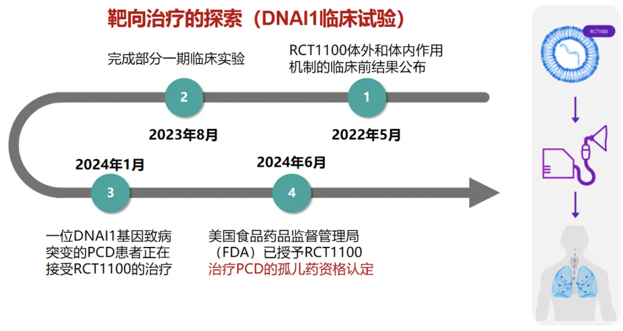 这是DNAI1临床实验的整个历程。在2024年6月,美国食品药品监督管理局(FDA)已授予DNAI1靶向治疗药物RCT1100治疗PCD的孤儿药资格认定。