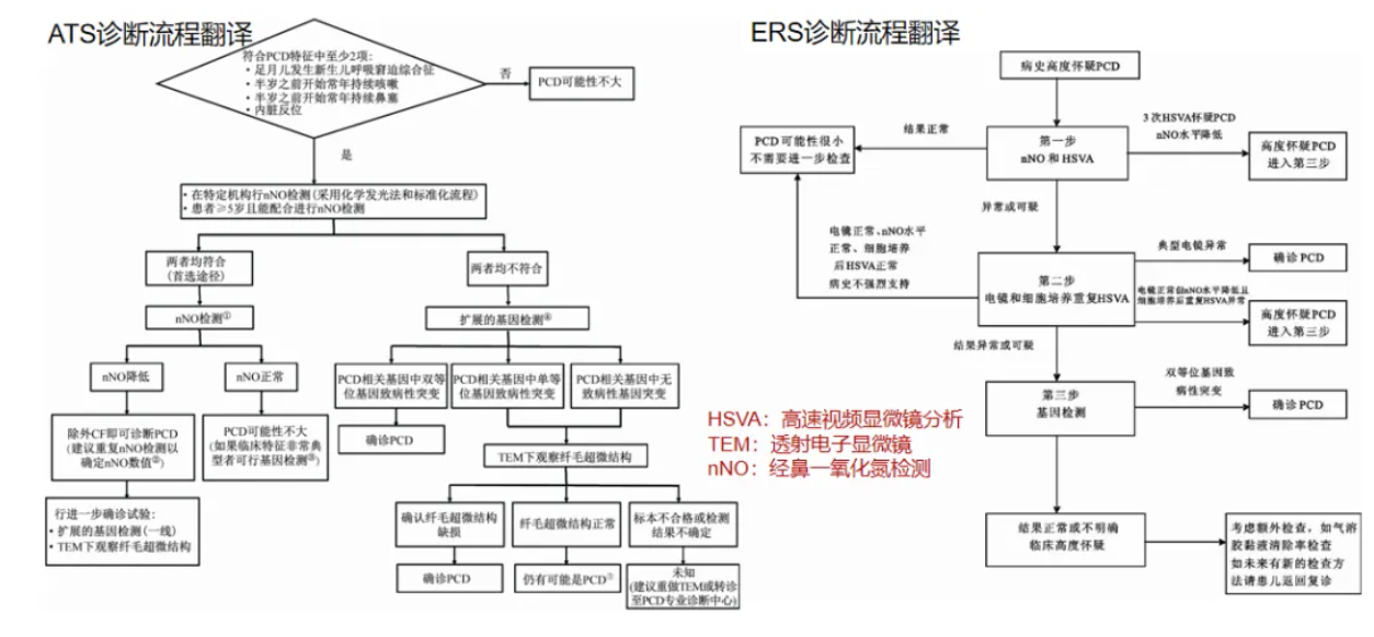 针对PCD高危人群的筛查实践,欧美国家已建立较为完善的体系。左图为美国胸科协会(ATS)诊断流程,其基于nNO检测、基因检测、透射电镜制定了系统性筛查方案;欧洲呼吸学会(ERS)同样具备标准化的诊断流程筛查机制,其额外强调高速视频显微分析(HSVA)在PCD诊断中的重要性。在我国目前主要遵循欧洲呼吸学会(ERS)指南开展筛查工作[1-2]。