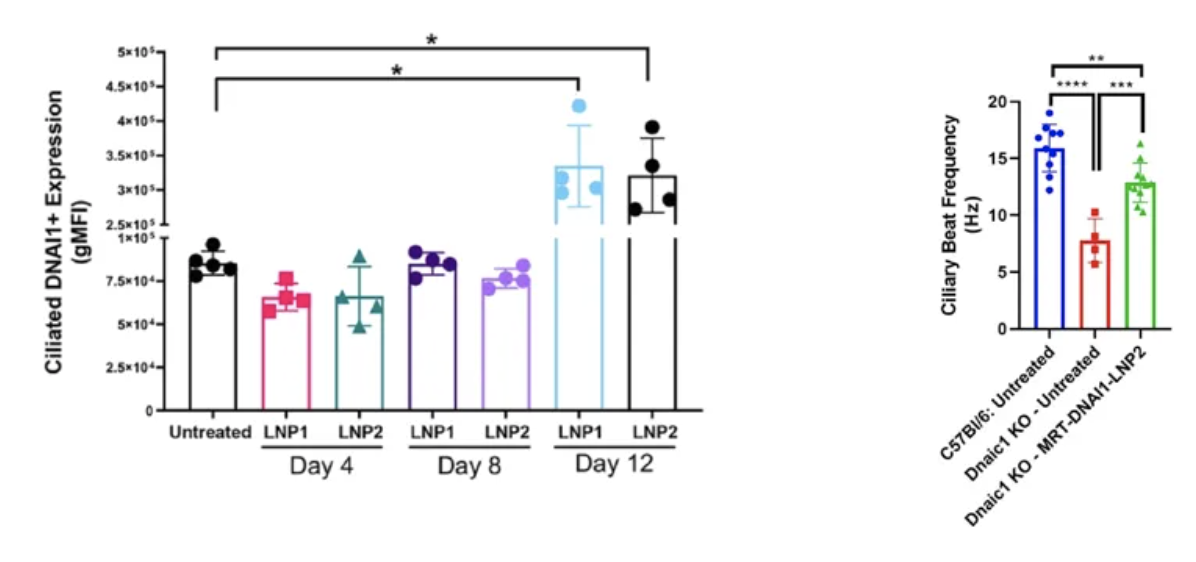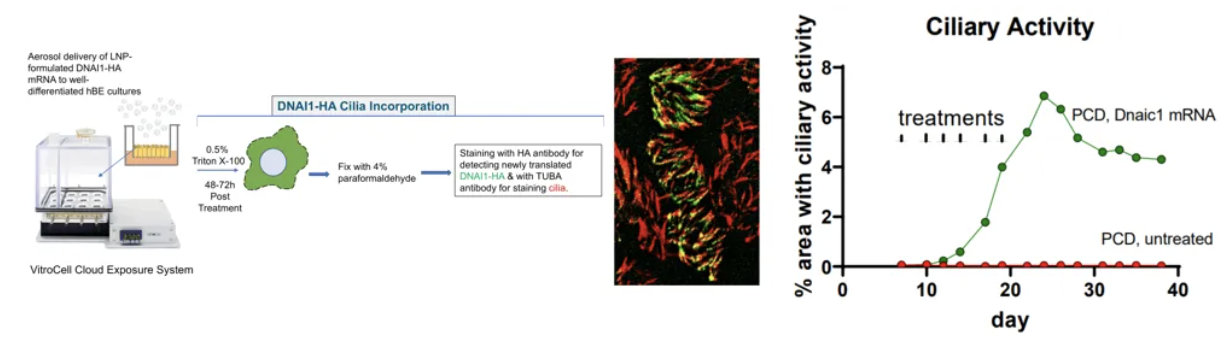 关于靶向治疗的探索,有DNAI1细胞试验,显示经过优化的mRNA脂质纳米粒(雾化)的蛋白表达水平更高,细胞炎症反应更低。DNAI1 mRNA脂质纳米粒(雾化)能在体外细胞模型中恢复纤毛的摆动,效果可持续数周[25]。