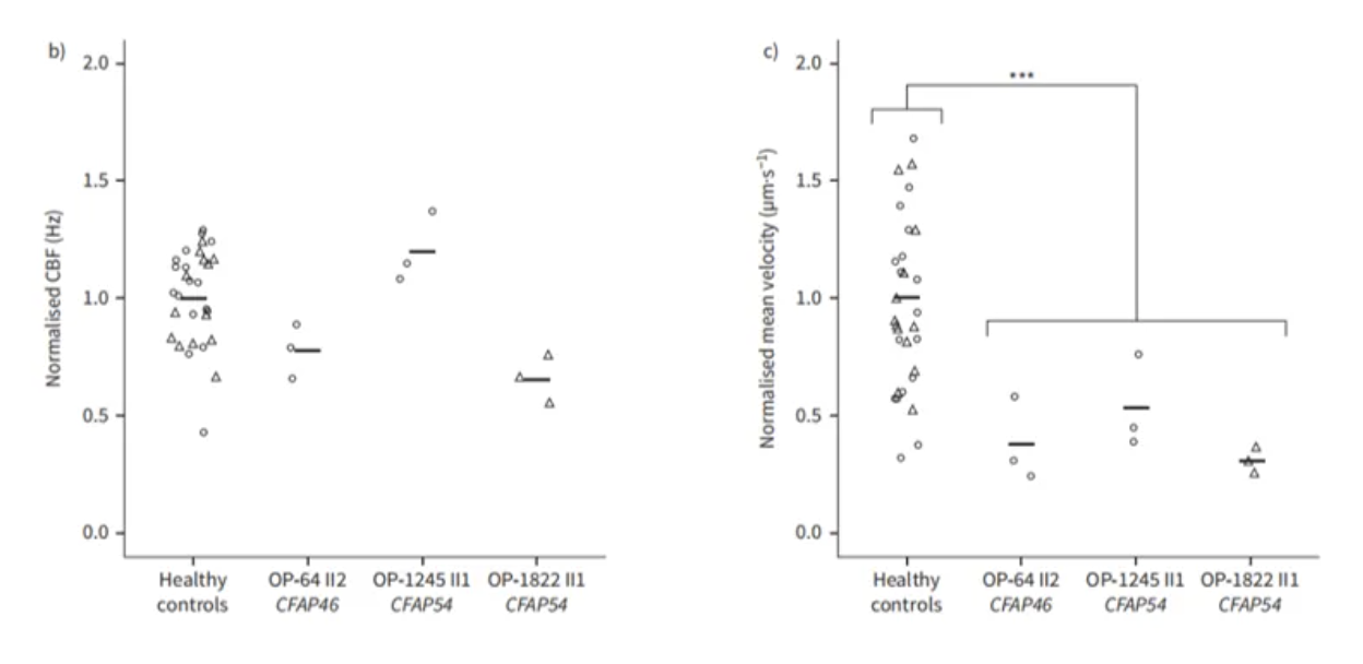 以下为我中心诊断PCD患者的两个案例。Case 1:男性患者,20岁,咳嗽咳脓痰伴鼻塞流脓涕10余年,CT显示鼻窦炎、支扩,无内脏反位。父母非近亲,妹妹体健。经鼻一氧化氮:9.0 nL/min(正常值>77 nL/min)高速视频显微镜分析:纤毛摆动极度僵硬。建议:完善父母的基因检测,检测这两个变异位点是否为双等位(Sanger测序)[13]。