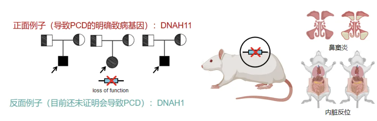 何为阳性结果?①基因的致病性明确(目前已有超过50个明确可导致PCD的致病基因)。需满足以下两个条件:既往有多个PCD家系报道该基因变异(变异的类型为明确loss of function的变异;动物实验成功验证基因变异会导致PCD。下面通过两个例子说明,我们在三个家系中发现DNAH11的纯合突变可以导致PCD的经典临床表现,且动物模型同样具有鼻窦炎和内脏反位,因此DNAH11被认定为是PCD的致病基因,而DNAH1既往只有一个DNAH1 loss of function报道的PCD家系,其他的都是错义变异或者非PCD家系。既往动物模型没有鼻窦炎和内脏反位的报道[7-8],因此目前不能认定它是PCD的致病基因。