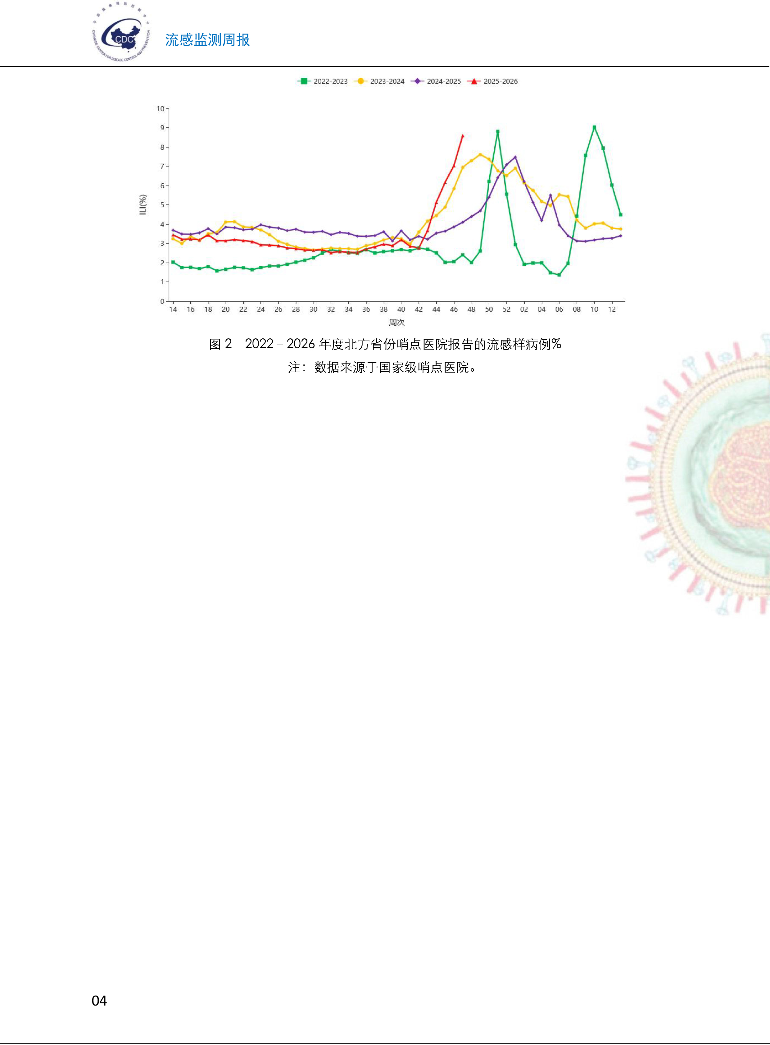 - 北方省份哨点医院报告的 ILI%为 8.6%,高于前一周水平(7.0%),高于2022年、2023 年和 2024 年同期水平。