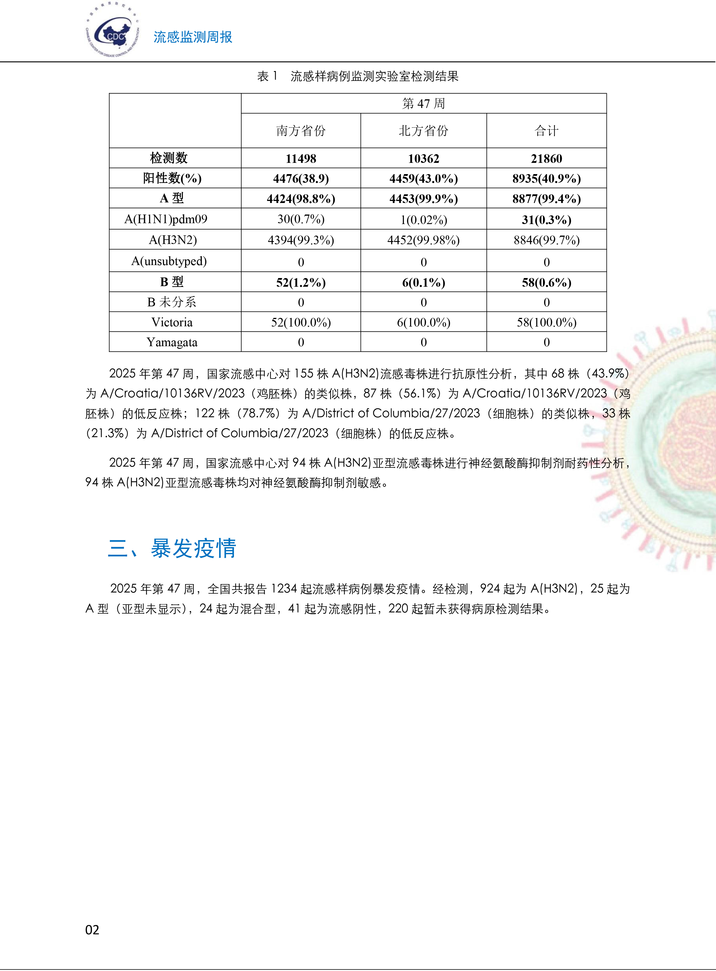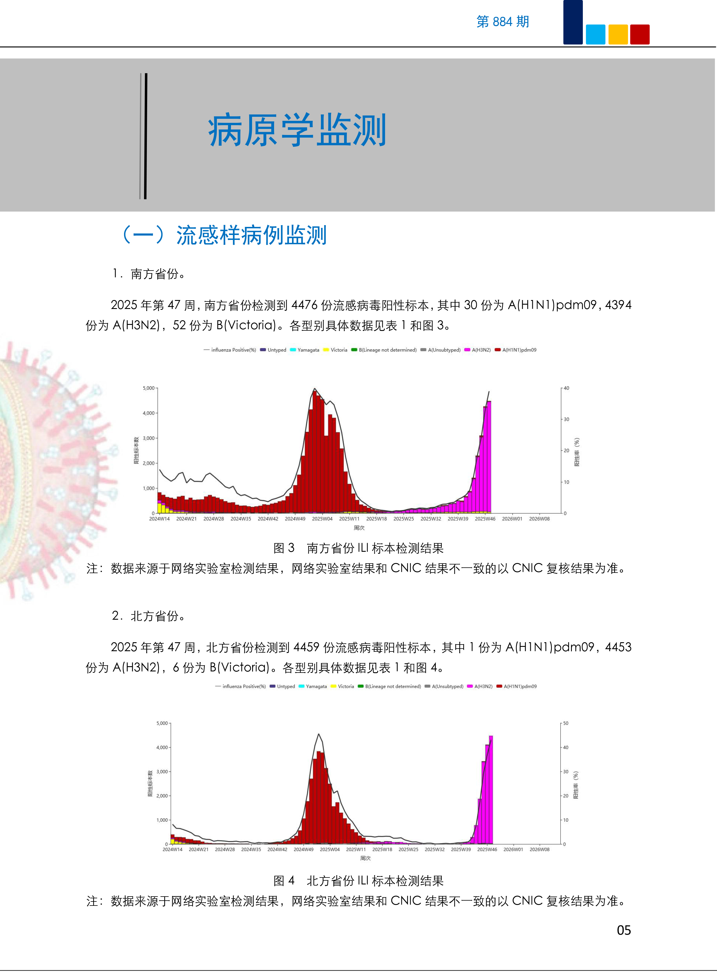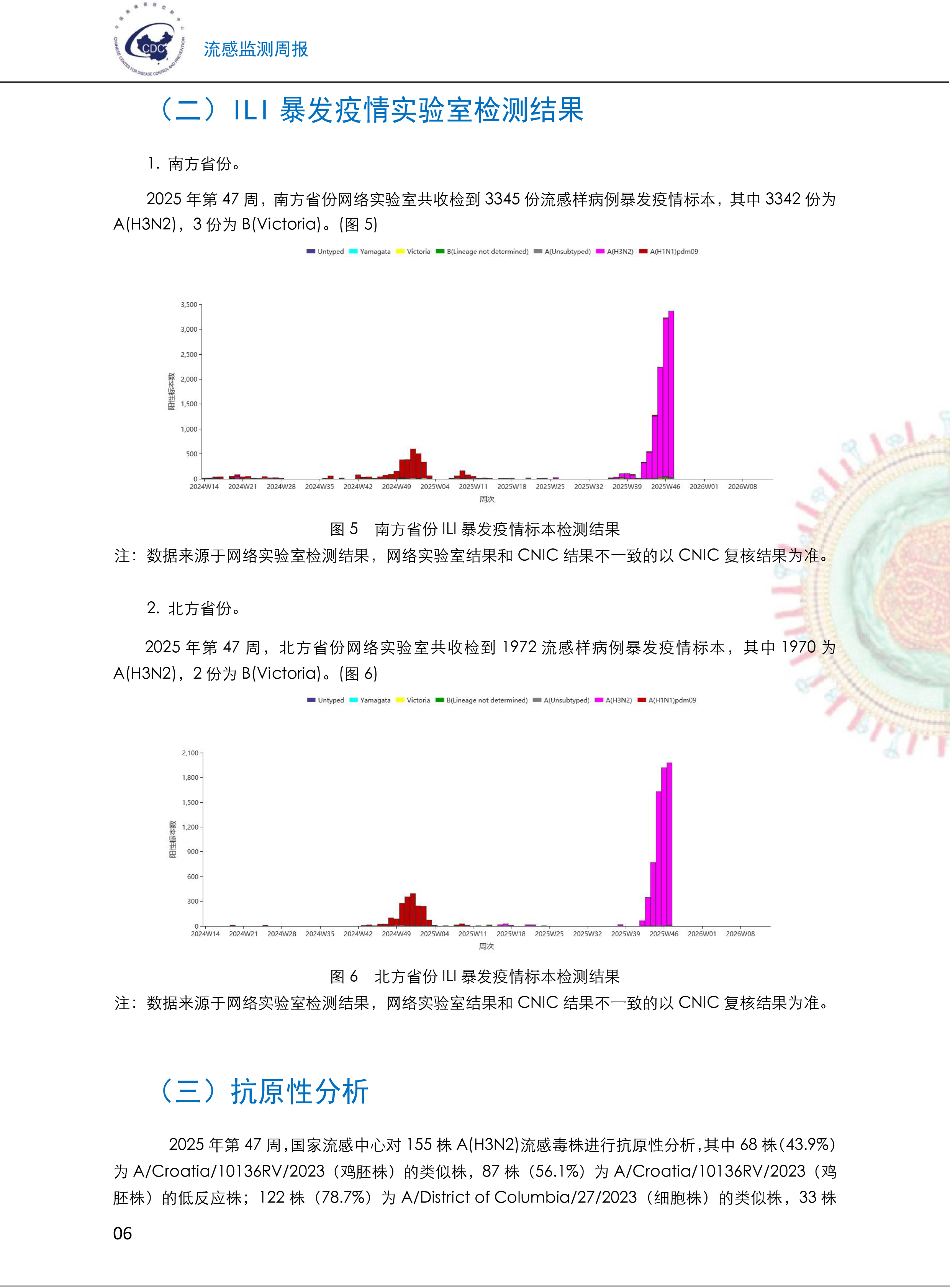 - 南方省份检测到 4476 份流感病毒阳性标本,其中 4394份为 H3N2;北方省份检测到 4459 份流感病毒阳性标本,其中4453份为 A(H3N2)。