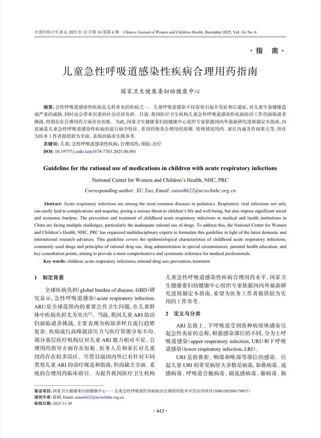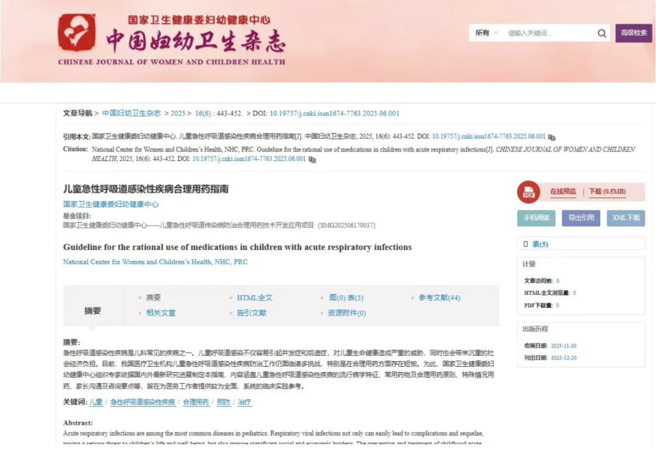 “孩子一发烧,就怕是肺炎,赶紧输液消炎。”这是无数中国家长的真实心态写照。然而,这种“防御性用药”正在为儿童健康埋下隐患。近日,国家卫生健康委妇幼健康中心正式发布《儿童急性呼吸道感染性疾病合理用药指南》(以下简称《指南》)。这份备受瞩目的文件,全面披露了当前儿科用药的严峻现实,尤其是针对抗生素滥用、流感防治误区等行业痛点,为我国临床医师提供了更有力的证据支持和指导意见。该《指南》已经在国内权威医学期刊《中国妇幼卫生杂志》2025年12月第6期刊发。