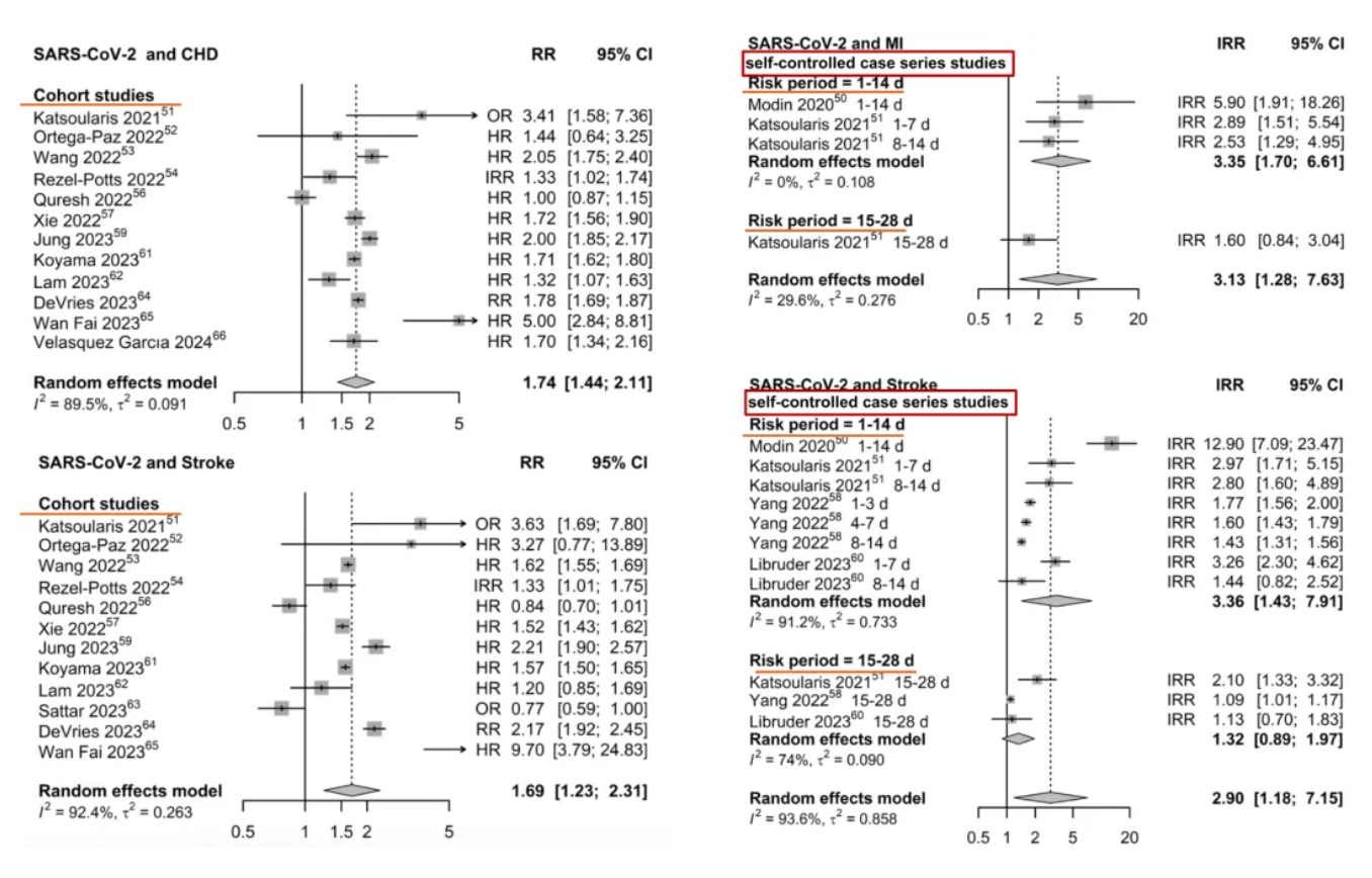 流感已流行多年,而近几年COVID-19也被视为重大威胁,下图比较了两者对心血管疾病的影响:就心肌梗死而言,COVID-19感染后14天内风险升高约3.35倍,15-28天内约为3.13倍,其升高幅度总体低于流感,但风险持续时间可能更长,至28天时风险仍未完全回落。脑卒中风险方面,COVID-19感染后1-14天内风险约为3.36倍,15-28天内约为1.32倍。总体而言,流感每年导致约29万至65万人死亡,COVID-19虽然对呼吸系统影响可能更大,但其对心血管的影响强度似乎不及流感。