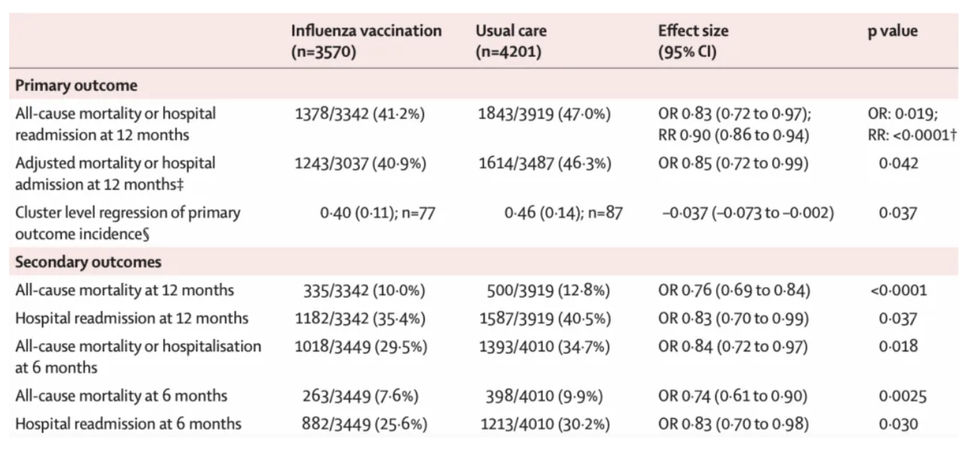 图:心肌梗死后流感疫苗接种。为一项随机、双盲、安慰剂对照的多中心试验,主要终点指标为随机分组后 12 个月内所有原因导致的死亡、心肌梗死或支架血栓形成的综合情况