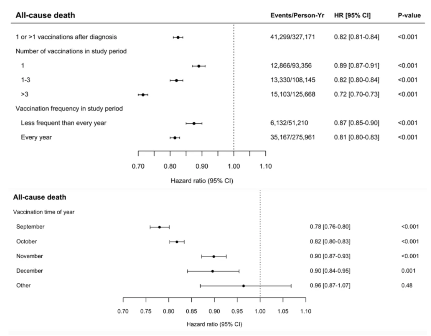 该研究还提示了一个有趣现象:接种时机影响保护效果。9月接种保护效应最强,随后逐月递减,可能因为推迟接种错失了在流行季前获得保护的机会。因此我们提倡尽早接种。