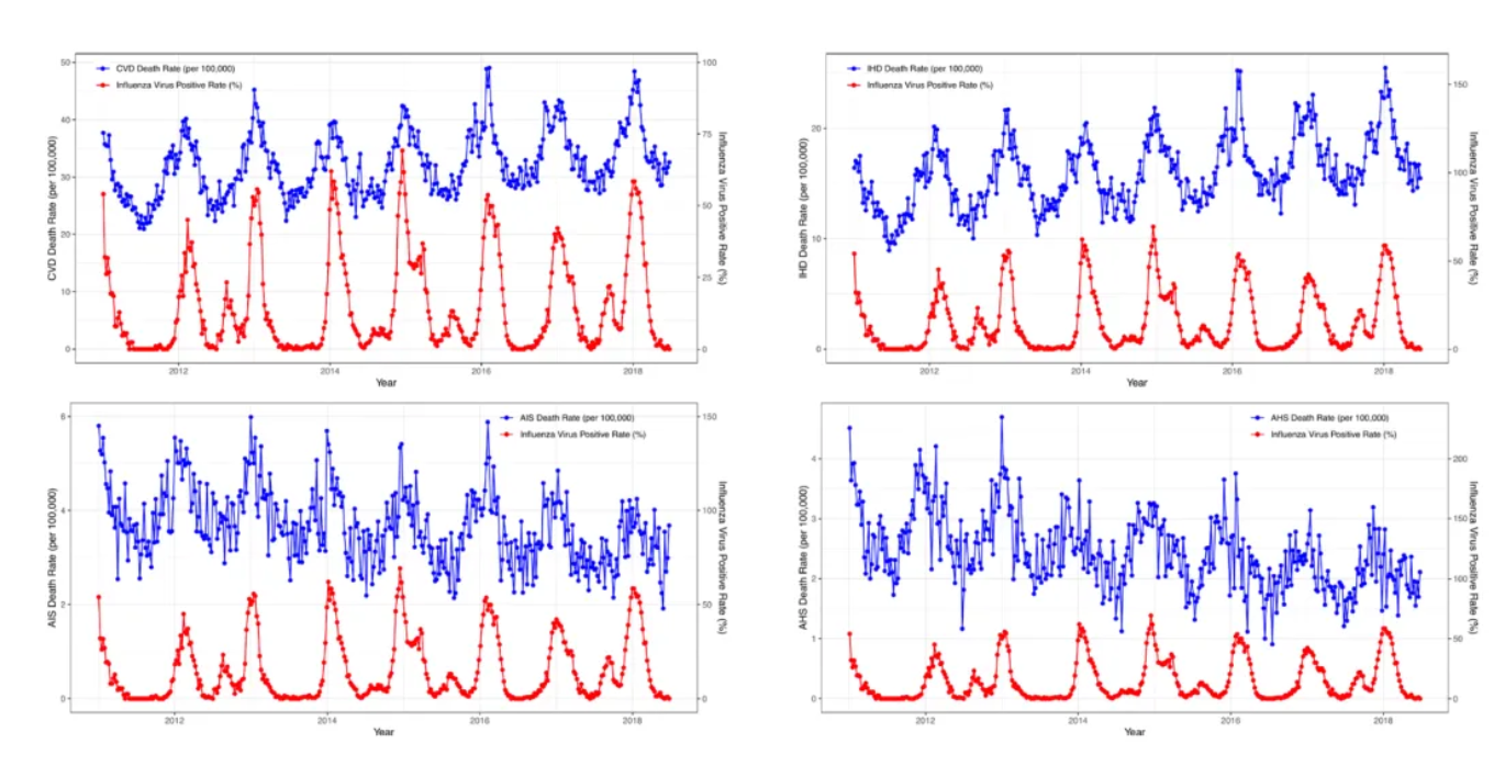 前几年,我们与北京市CDC王全意主任团队合作了一项研究。该研究提示,流感流行季节与心血管疾病的超额死亡间存在显著相关。如下图所示,红色曲线代表流感流行强度,其高峰时段与心血管疾病死亡的发生在时间点上完全吻合。