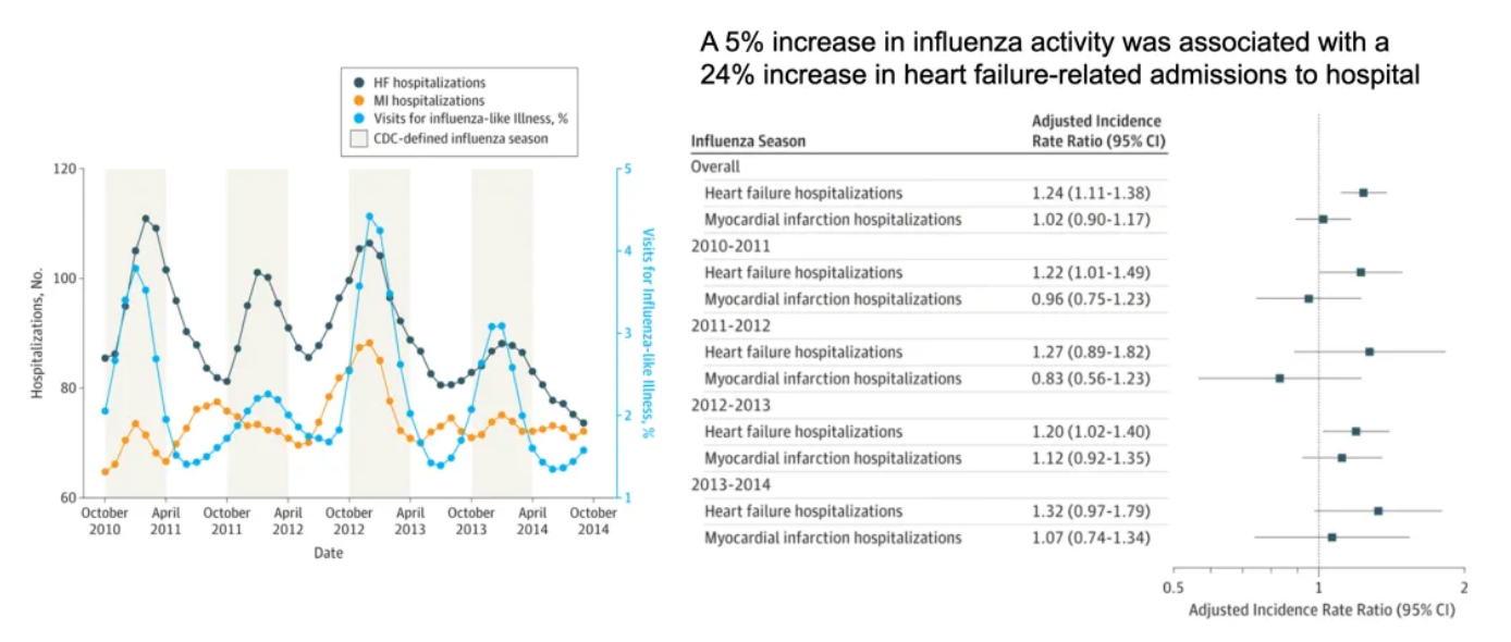 一项美国监测数据显示,流感活跃度(下图浅蓝色曲线)与心衰住院率在时间上完全吻合。该研究计算得出,流感流行强度每增加5%,心衰住院风险会增加24%。考虑到今年我国流感流行强度高峰曾达60%,这将导致心衰住院风险大幅上升。因此流感流行季节,心衰病房常住满了患者。这些现象启发我们思考:为何不利用流感疫苗来避免这种情况?