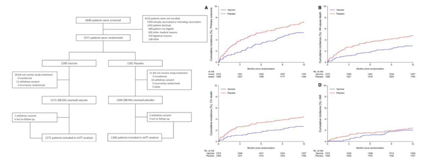 结果显示,疫苗接种组的主要复合终点事件显著减少。下图有所展示,可见全因死亡本身降低了约40%,心血管死亡同样降低了相近幅度,心肌梗死事件也呈下降趋势(尽管因发生率较低,差异未达显著水平)。该研究提供了极具说服力的证据,并且是安慰剂对照的、高等级循证医学证据。