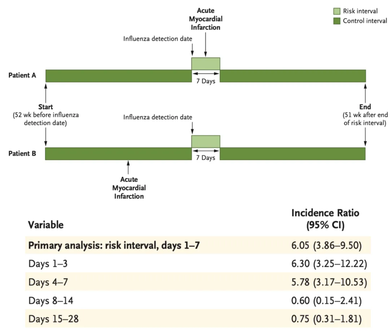 大家或许还对2018年发表在《新英格兰医学杂志》上的一篇文章有印象,这篇文章发表后曾被多家媒体转载,其核心结论是:流感感染会将急性心肌梗死的发病风险提升6倍。该研究采用病例交叉的研究方法:即比较同一个体在流感感染后7天内(暴露期)发生心肌梗死的风险,与其在一年内其他时间(对照期)发生心肌梗死的风险。结果显示,在感染初期一周内,心肌梗死风险升高约6倍,随后该风险逐渐下降,约一个月后不再显著。