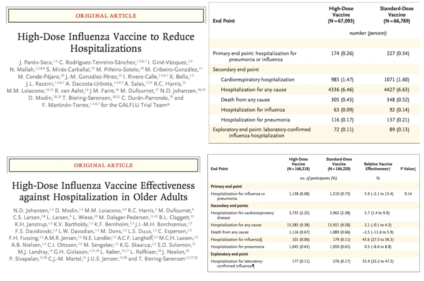 其他相关研究:一位丹麦学者报告了其团队同日在《新英格兰医学杂志》、《JAMA》发表的多篇研究比较了高剂量与标准剂量流感疫苗的效果。研究在西班牙和丹麦分别开展,采用相同方案。