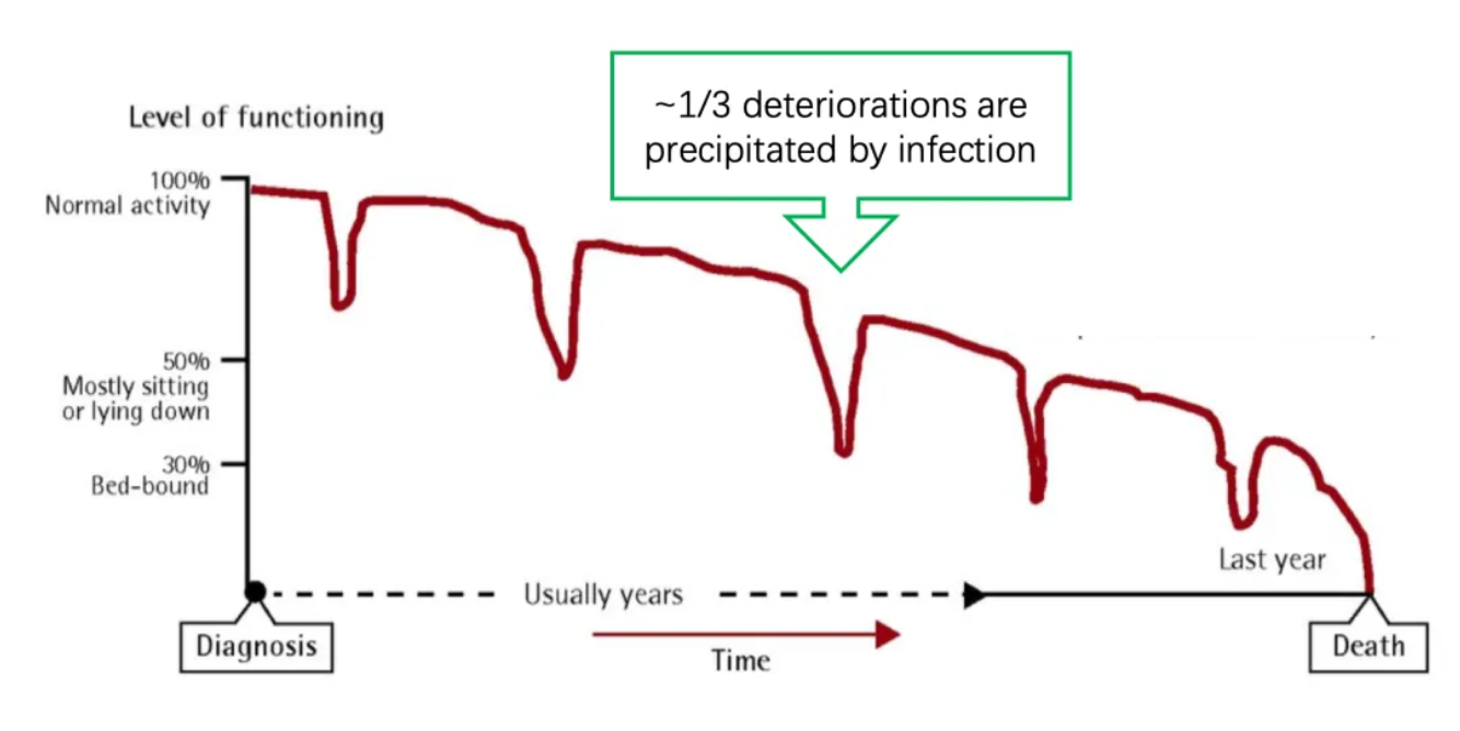 已有研究揭示,心衰与流感关系密切。心衰患者因肺淤血、体质虚弱,且需频繁往返医院就医、取药,接触病毒机会多,易感性高。其发生呼吸道感染的风险是普通人群的3倍,一旦感染,死亡率是普通人群的4倍。每次感染诱发的心衰加重都可能导致患者心功能无法恢复至原有水平,多次加重最终使病情走向终末期。我们总是处理心衰的医生都熟悉这条曲线:所有心衰加重事件中,约1/3由感染诱发,而流感是最常见的感染类型。因此,再次强调,预防流感对心衰患者尤为重要。