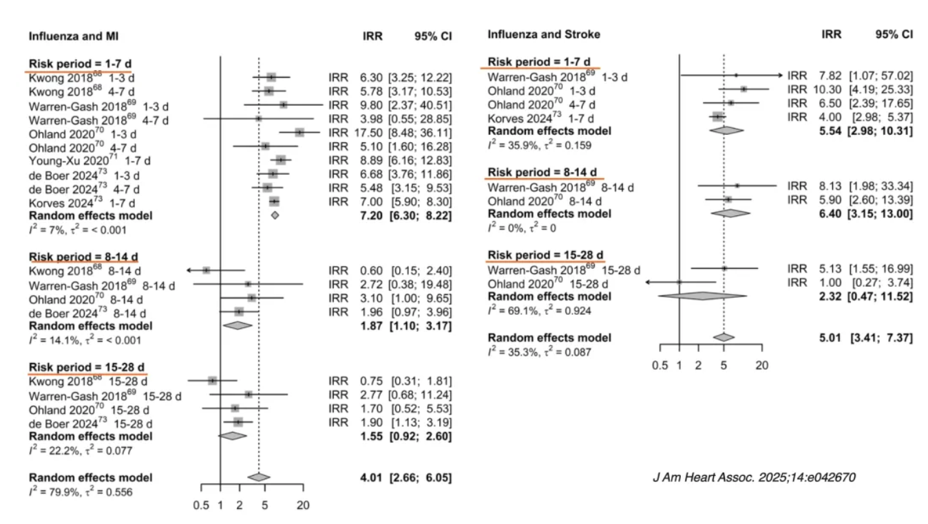 这些研究间接证实了流感与心肌梗死之间的强关联。目前已有众多研究观察到此现象。不久前发表在心血管领域的重要期刊《美国心脏协会杂志》(J Am Heart Assoc)上的一篇荟萃分析汇总了流感和心肌梗死相关性的研究。结果显示,在流感感染后1-7天内,心肌梗死风险升高至7.2倍;8-14天内为1.87倍;15-28天内为1.55倍(下图左)。流感与脑卒中风险的相关性同样显著:感染后1-7天内风险为5.54倍,8-14天内为6.4倍(下图右)。这些结果与我们报告的研究一致,表明流感感染后28天内,患者发生心肌梗死和脑卒中的风险持续升高。因此,在这段“风险窗口期”内加强预防至关重要。当然,最理想的策略是预防流感本身的发生。