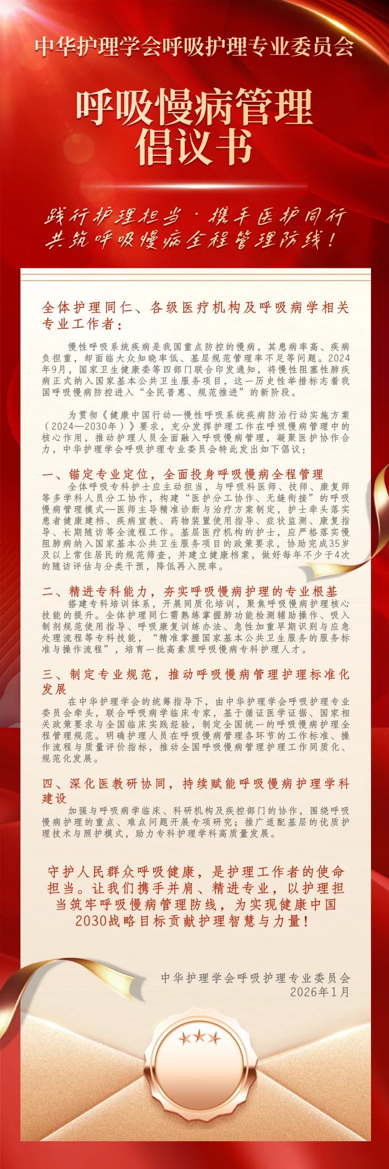 在2026中国呼吸学科发展大会上,呼吸慢病(慢阻肺病、哮喘等)防治工作迎来关键里程碑,中华护理学会呼吸护理专业委员会向全体护理同仁、各级医疗机构及呼吸病学相关专业工作者发出《践行护理担当 携手医护同行 共筑呼吸慢病全程管理防线》的呼吸慢病管理倡议(详细内容见后文),推动我国呼吸慢病管理迈入规范化、同质化、全民普惠的新阶段。倡议一、锚定专业定位,全面投身呼吸慢病全程管理:护士应主动担当,与医生紧密协作,在风险筛查、科普宣教、康复治疗、随访复诊过程中发挥核心作用,协同筑牢管理防线;倡议二、精进专科能力,夯实呼吸慢病护理专业根基:掌握肺功能辅助操作、吸入装置指导、呼吸康复方法等核心技能,成为高素质的呼吸慢病护理人才;倡议三、制定专业规范,推动呼吸慢病管理护理标准化发展:明确标准、流程与质控指标,推动护理工作同质化、规范化;倡议四、深化医教研协同,持续赋能呼吸慢病护理学科建设。
