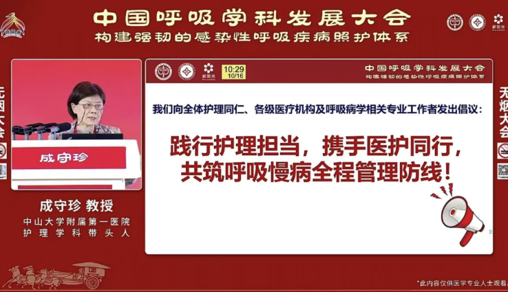中华护理学会呼吸护理专业委员主任委员,中山大学附属第一医院的成守珍教授在大会上同时做了关于“2025年呼吸慢病全程管理护理能力提升项目”进展及2026年工作计划报告。