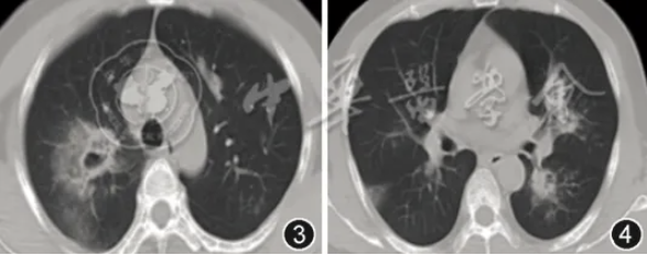 图3,4 2025年1月14日(经抗甲流+抗细菌治疗10 d后)胸部CT示双肺多发实变影伴空洞形成