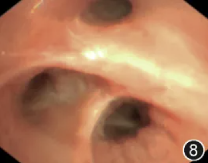 图8 外径6.0 mm支气管镜下见右上叶支气管各段开口通畅,无法窥及尖段、后段亚支菌栓阻塞