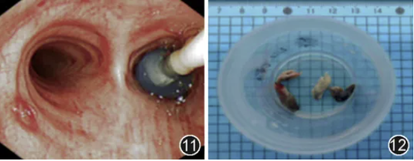图12 外径4.0 mm支气管镜下活检钳钳夹取出的菌栓,来自右上叶尖、后段,其中最左侧菌栓来自于右上叶后段b亚支,取出时发生气道大出血