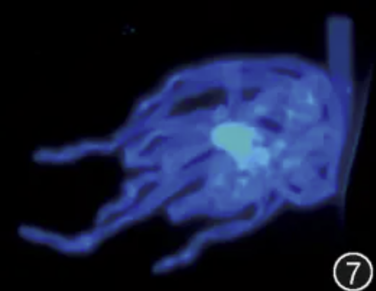 图7 坏死物刷片荧光真菌染色ROSE阳性,菌丝体呈飘带征,无分隔,考虑毛霉 免疫荧光染色 高倍放大