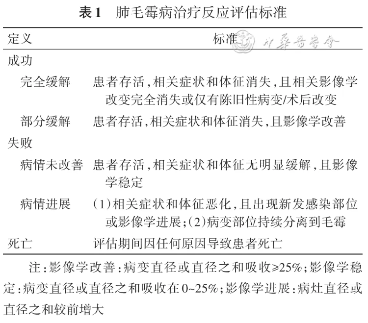 陈瑞玲(药学部):肺毛霉病目前推荐的治疗药物主要有L-AmB及其复合静脉制剂、泊沙康唑、艾沙康唑等。目前多项国际指南仍然推荐L-AmB为毛霉病的一线治疗方法,推荐的剂量是L-AmB 5~10 mg·kg-1·d-1,此外通过雾化和支气管镜灌注L-AmB也可用于治疗肺毛霉病。泊沙康唑目前有3种剂型[7]:口服混悬液、肠溶片和注射液,后两者的生物利用度更高,故2019年ECMM全球指南[8]中将这两种剂型作为一线治疗,其治疗毛霉病的总成功率为54%。泊沙康唑的血清浓度与治疗及预防真菌感染的效果密切相关,因此,建议监测泊沙康唑的血清浓度。艾沙康唑作为新型唑类药物,比泊沙康唑半衰期更长,分布容积更大,可透过血脑屏障增加脑脊液的药物浓度。不良反应方面,艾沙康唑的耐受性良好,故在肾功能不全的毛霉病患者中更推荐艾沙康唑作为首选药物[3]。此例患者的L-AmB静脉治疗剂量在标准范围内,但仍迅速出现肾功能损害,减量后肾功能仍未恢复而停用,换用艾沙康唑静脉滴注联合支气管镜介入治疗后,肾功能逐渐恢复正常,毛霉也得到有效控制。待患者病情稳定后可转换为艾沙康唑口服制剂序贯治疗[9]。目前治疗毛霉病的疗程尚不清楚,最终应基于临床、影像学、微生物学检测结果及患者的免疫抑制状态是否改善综合判断(表1),建议总疗程至少3~6个月,其中静脉给药4~6周直到病情稳定后可转为口服艾沙康唑或泊沙康唑[8]。