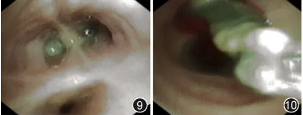 图9,10 外径4.0 mm支气管镜下可见右上叶后段a、b亚支分别被菌栓阻塞(图9),支气管镜下活检钳夹除右上叶后段b亚支菌栓时出现气道大出血(图10)
