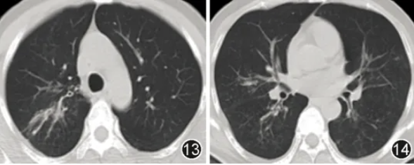 图13,14 2025年4月2日胸部CT示右上叶空洞基本闭合,双肺实变影较前吸收