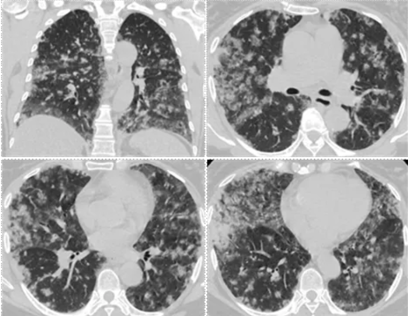 胸部 CT:双肺弥漫斑片状磨玻璃密度灶,部分边界欠清,病变主要沿支气管血管束分布,以双肺中外带、胸膜下为著,其内可见小叶间隔增厚,伴多发片状小实变灶(图1)。