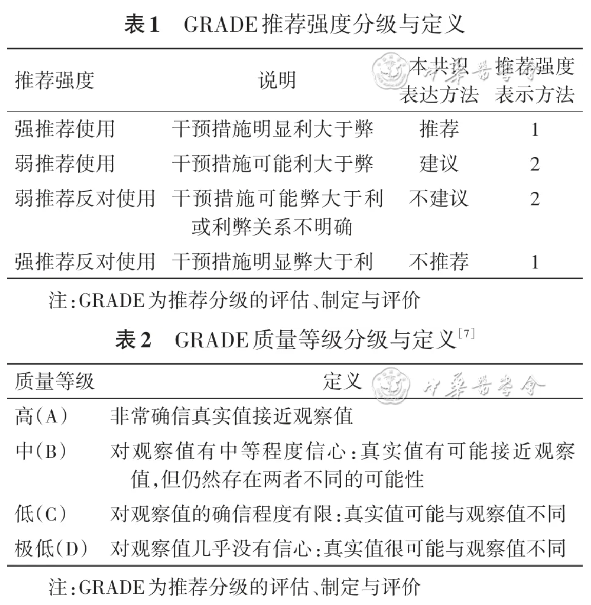在本共识中,证据等级和推荐等级参照GRADE推荐强度分级标准[7],一般来讲,证据等级越高,推荐等级也越高,但证据等级和推荐等级并不完全对应,还需要权衡患者意愿、价值观和资源消耗作出判断(表1、2)。
