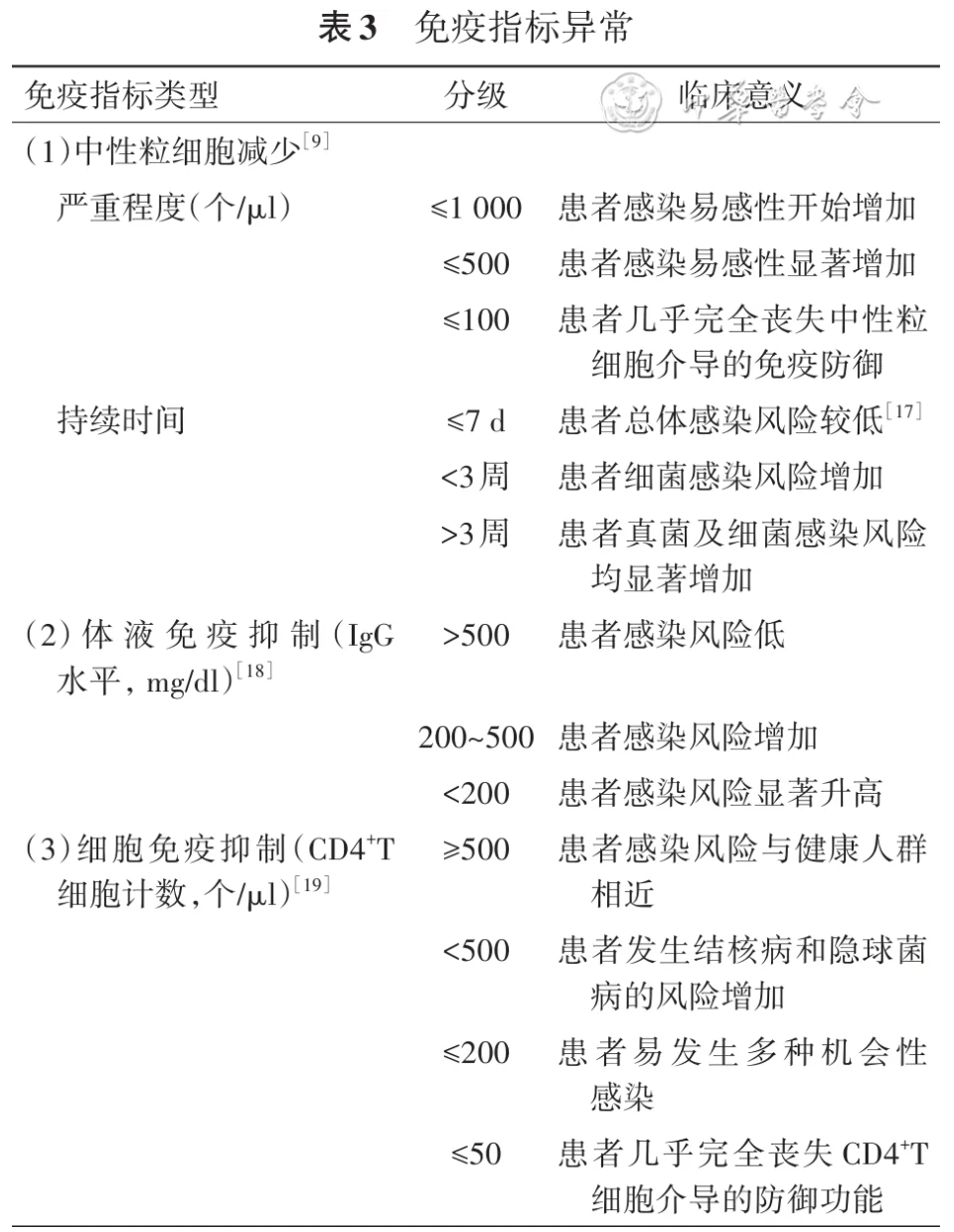 1. 基础疾病或治疗史[10]:(1)原发性免疫缺陷疾病;(2)活动性恶性肿瘤,不包括局限性皮肤癌和早期癌症(如1期肺癌)患者;(3)正在接受癌症化疗[10];(4)HIV感染者CD4+T淋巴细胞计数<200个/μl或百分比<14%[11];(5)实体器官移植;(6)异基因造血干细胞移植;(7)长期激素治疗:等效泼尼松剂量≥20 mg/d,持续治疗≥14 d 或累积剂量>600 mg泼尼松(即患者需要接受至少 3~4周的糖皮质激素治疗)[12, 13];(8)正在接受生物免疫调节剂治疗[14, 15];(9)正在接受抗风湿药物或其他免疫抑制剂(如环孢素、环磷酰胺、羟氯喹、甲氨蝶呤)治疗[16];(10)其他可以引起中性粒细胞减少、淋巴数量细胞减少或球蛋白减少的情况。对怀疑免疫抑制宿主,应常规检测T细胞亚群、免疫球蛋白水平等免疫功能相关检查。