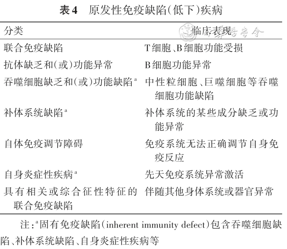 根据免疫功能受累成分的不同,原发性免疫缺陷可进一步分为以下几类:联合免疫缺陷(combined immunodeficiency)、抗体缺乏和(或)功能异常(antibody deficiency or dysfunction)、吞噬细胞缺乏和(或)功能缺陷(phagocytic cell deficiency or defect)、补体系统缺陷(complement deficiency)、自体免疫调节障碍(autoinflammatory and autoimmune disorder)、自身炎症性疾病(autoinflammatory disease),以及具有相关或综合征性特征的联合免疫缺陷(syndromic primary immunodeficiencies)[22, 23, 24](表4)。