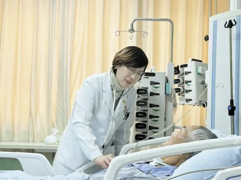 上海交通大学医学院附属瑞金医院呼吸与危重症医学科主任医师周敏为患者检查身体