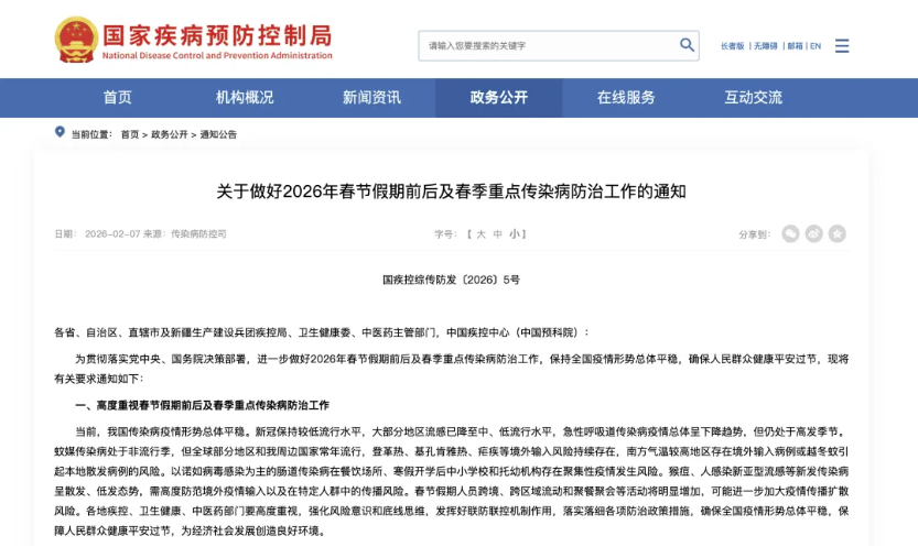 本文内容来源自“国家疾控局”官网、官微:关于做好2026年春节假期前后及春季重点传染病防治工作的通知