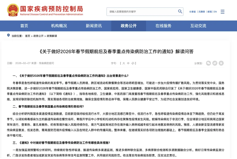 《关于做好2026年春节假期前后及春季重点传染病防治工作的通知》解读问答
